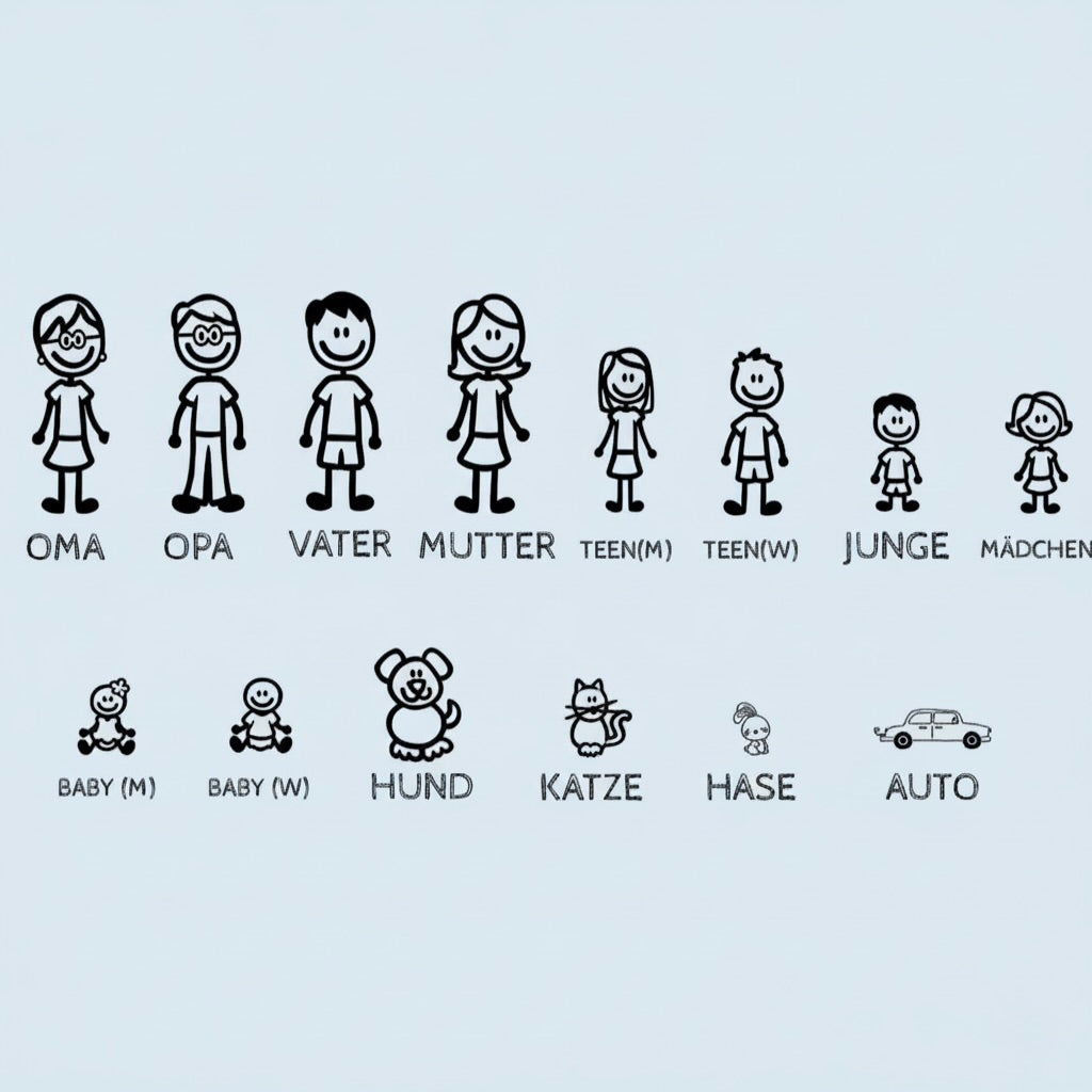Gestalte deine Fußmatte so einzigartig wie deine Familie – mit diesen liebevoll gestalteten Familienfiguren. Wähle aus verschiedenen Familienmitgliedern, Haustieren und Hintergründen, um die Matte ganz individuell zu gestalten.