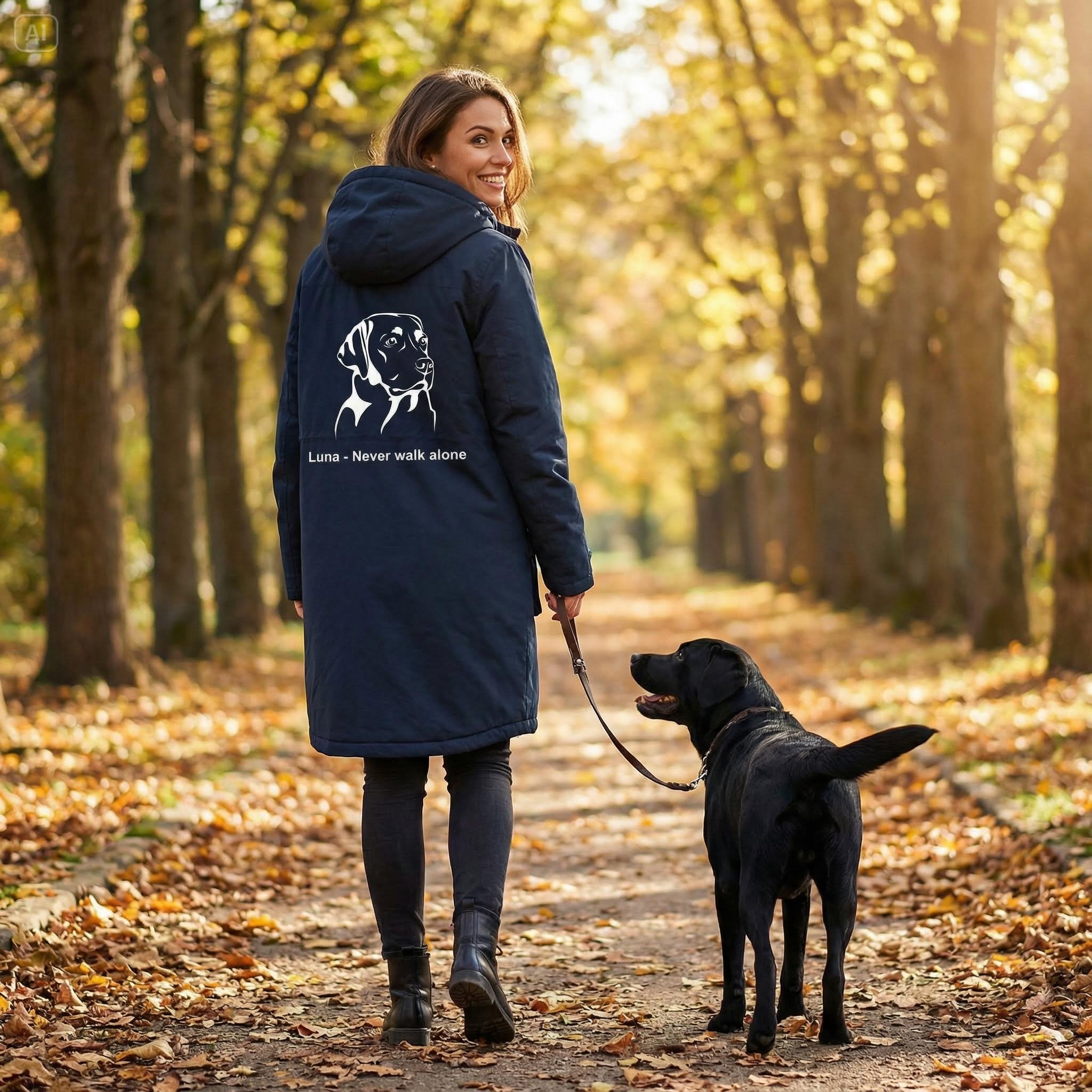 Personalisierbarer Gassi-Mantel für Hundebesitzer, wetterfest und warm ist zertifiziert mit GRS, amfori und WRAP