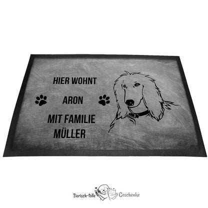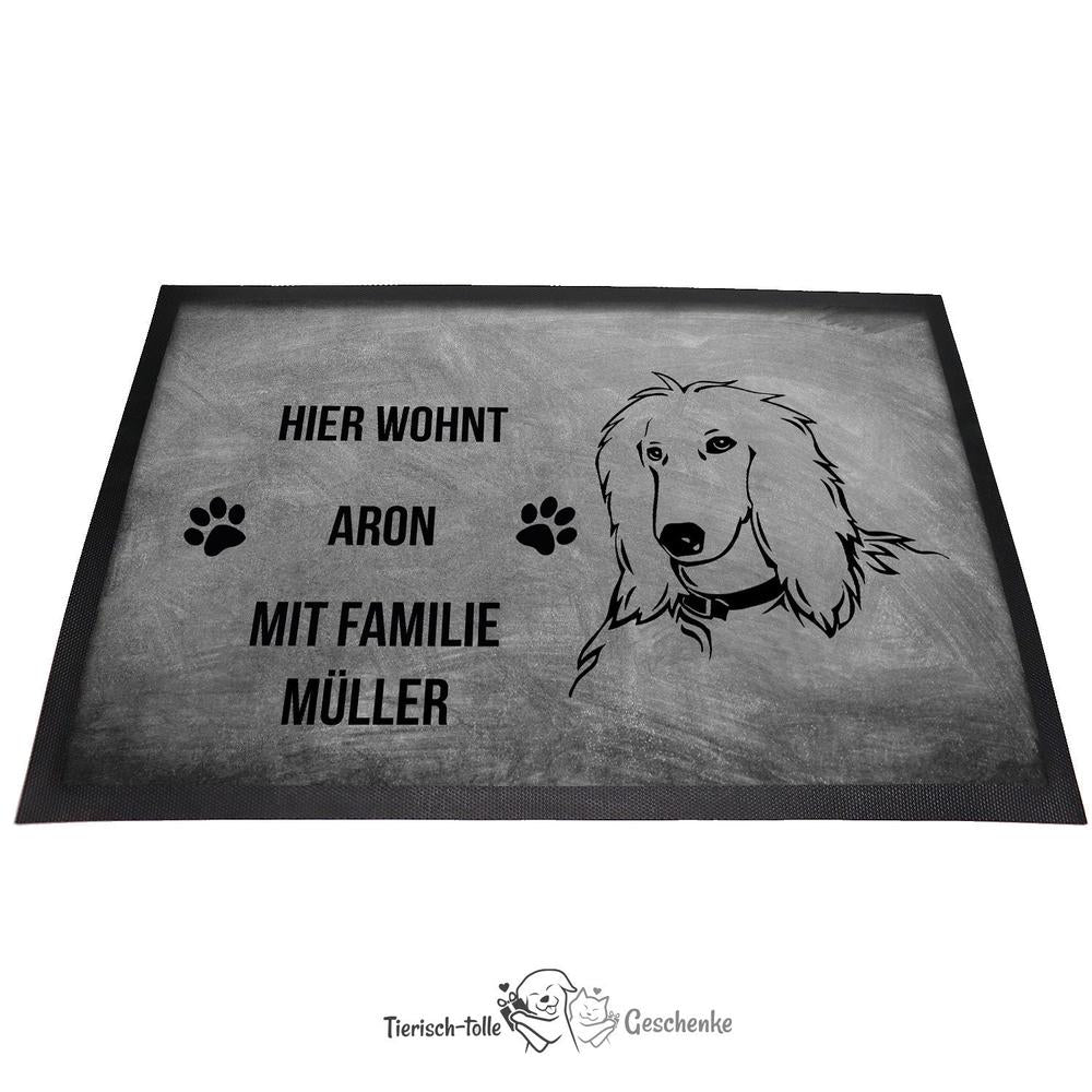 Ob als Geschenk oder für den eigenen Eingangsbereich – diese personalisierte Fußmatte bringt die außergewöhnliche Schönheit und Eleganz des Afghanischen Windhundes stilvoll zur Geltung.