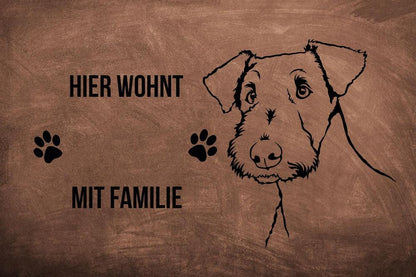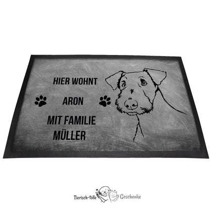 Ob als Geschenk oder für den eigenen Eingangsbereich – diese personalisierte Fußmatte bringt die lebhafte Energie und den mutigen Charakter deines Terriers stilvoll zur Geltung.