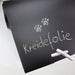 Die glatte und leicht gekörnte, schwarze Oberfläche in Schieferoptik kann mit handelsüblicher Kreide oder einem wasserbasiertem Kreidemarker beschriftet oder bemalt werden.
