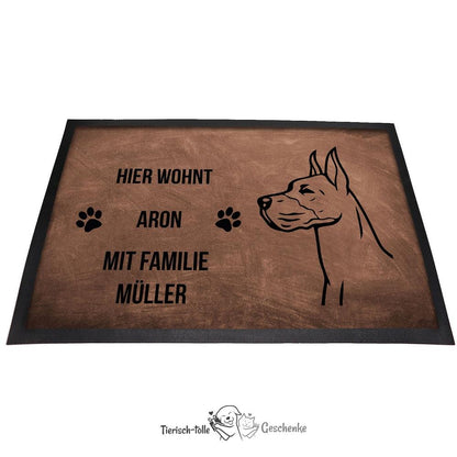 Ob als Geschenk oder für den eigenen Eingangsbereich – diese personalisierte Fußmatte bringt die imposante, sanfte und treue Natur der Deutschen Dogge stilvoll zur Geltung.
