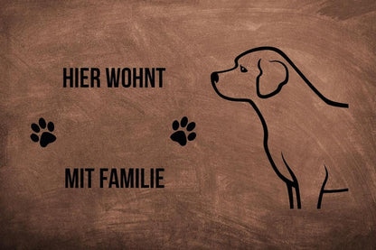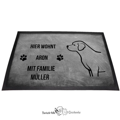 Ob als Geschenk oder für den eigenen Eingangsbereich – diese personalisierte Fußmatte bringt die freundliche Ausstrahlung und die treue Natur des Labrador Retriever stilvoll zur Geltung.
