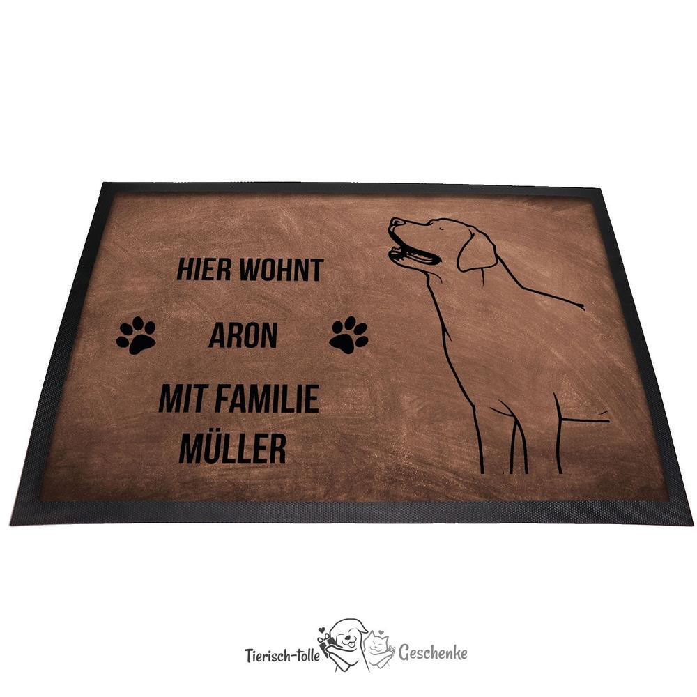 Ob als Geschenk oder für den eigenen Eingangsbereich – diese personalisierte Fußmatte bringt die verspielte Ausstrahlung und die treue Natur des Labrador Retriever stilvoll zur Geltung.