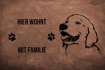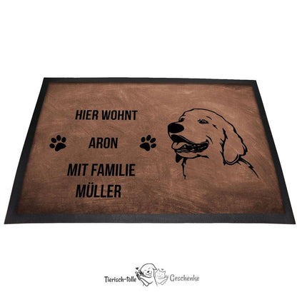 Ob als Geschenk oder für den eigenen Eingangsbereich – diese personalisierte Fußmatte bringt die sanfte Ausstrahlung und die treue Natur des Golden Retriever stilvoll zur Geltung.