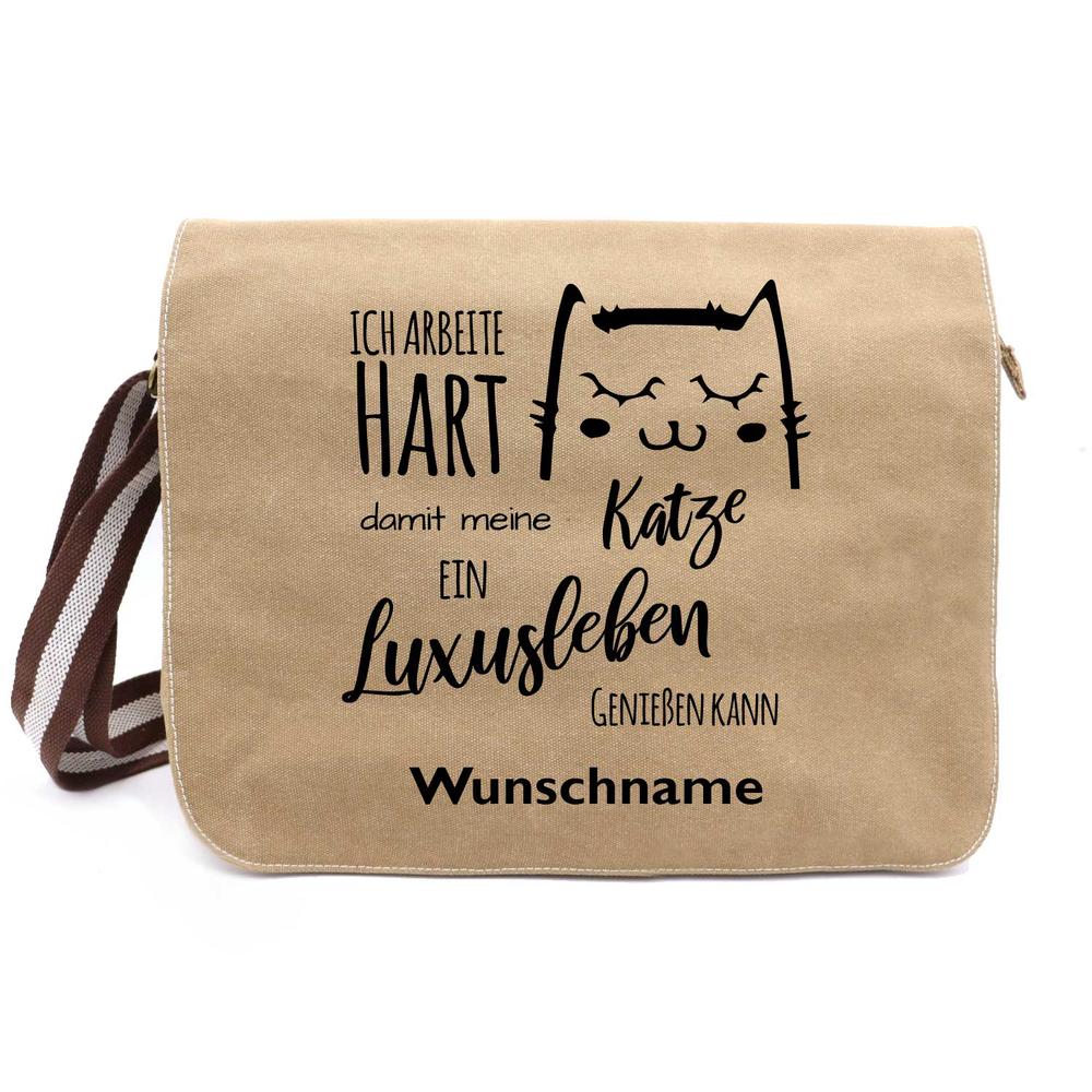 Ich arbeite hart Katze 2 - Canvas Schultertasche Messenger mit Namen - Tierisch tolle Geschenke