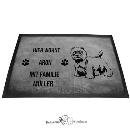Ob als Geschenk oder für den eigenen Eingangsbereich – diese personalisierte Fußmatte bringt die charmante Ausstrahlung und die mutige Natur des West Highland White Terrier stilvoll zur Geltung.